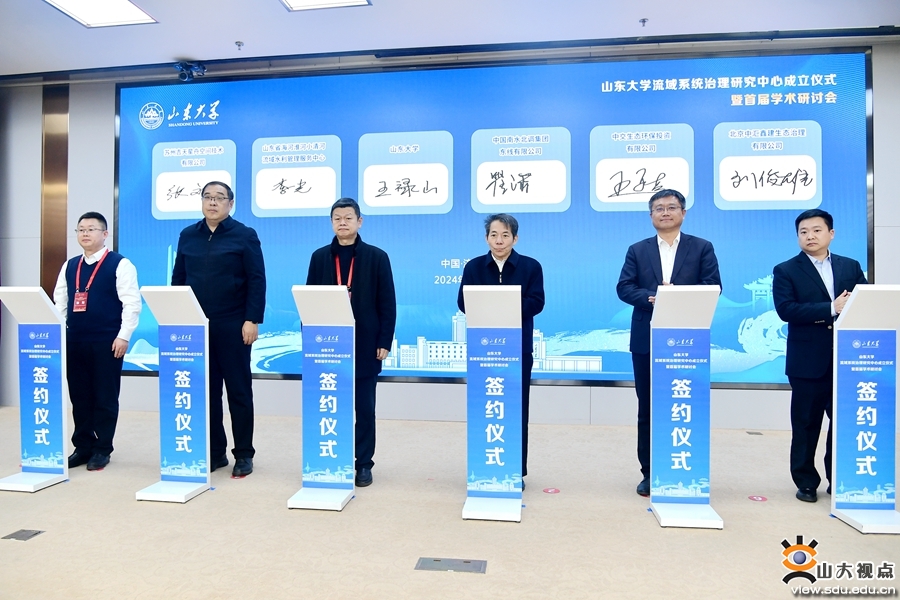 与会院士专家、水利厅领导、合作单位代表及学校领导共同为太阳成集团tyc9728流域系统治理研究中心揭牌。太阳成集团tyc9728与中国南水北调集团东线有限公司、山东省海河淮河小清河流域水利管理服务中心、中交生态环保投资有限公司、苏州吉天星舟空间技术有限公司、北京中汇鑫建生态治理有限公司共同在流域治理、水网建设、生态保护等多个领域签订合作协议。