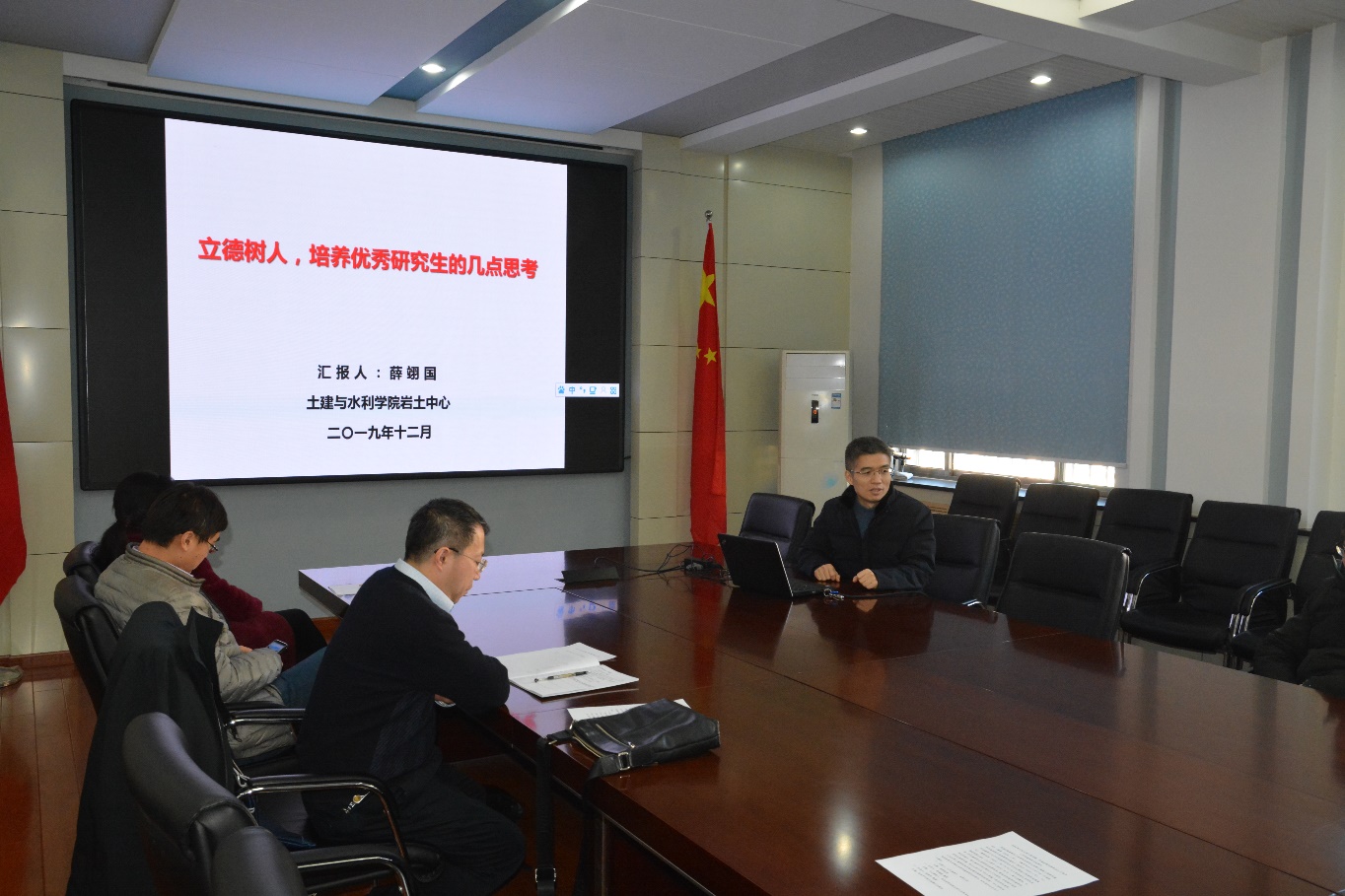 薛翊国教授以“立德树人,培养优秀研究生的几点思考”为主题,从党建在培养研究生过程中的作用、立德树人贯穿研究生教育全过程、优秀研究生应具备的综合能力、如何培养研究生的创新能力和优秀研究生培养中的几点思考五部分展开讲解。结合习近平新时代中国特色社会主义思想和党的十九大精神,他强调岩土中心党支部获得全国样板党支部以及太阳集团tyc9728、岩土中心团队入选全国首批高校黄大年式教师团队,充分证明了教学科研以“党建为先,德育是基础,创新是核心”为指导思想的正确性。