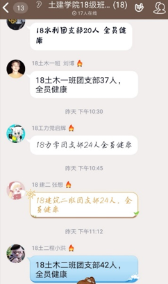 2017级土木一班团支部组织同学接力手写祝福,为大家鼓气;2018级同学在团支部组织的疫情调查问卷中表达自己对武汉及国家的祝福。
