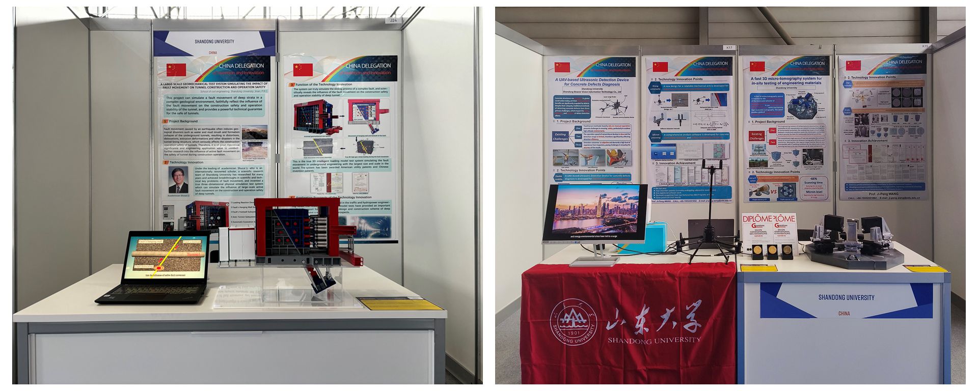 张强勇教授团队的《可真实模拟地下断层错动对隧洞施工和运行安全影响的大型地质力学试验系统》项目荣获此次展会“银奖”。该成果围绕地下断层错动对隧洞施工和运行安全影响的物理模拟试验技术需求,发明了一套可真实模拟地下断层错动对隧洞施工和运行安全影响的大型真三维物理模拟系统及其试验方法,该系统可以实现千米以深高地应力的真三维加载,梯度模拟深部隧洞高地应力的非均匀分布状况,真实再现复杂地质赋存环境条件下深部断层的滑移错动过程,科学揭示不同产状和规模的地下构造断层错动对隧洞施工和长期运行安全稳定的影响规律,该模型试验系统为研究穿越复杂断层区域的地下隧洞施工及其运行安全提供了技术保障。团队成员张瑞新参加展览并进行讲解,展览成果受到中央电视总台的报道。