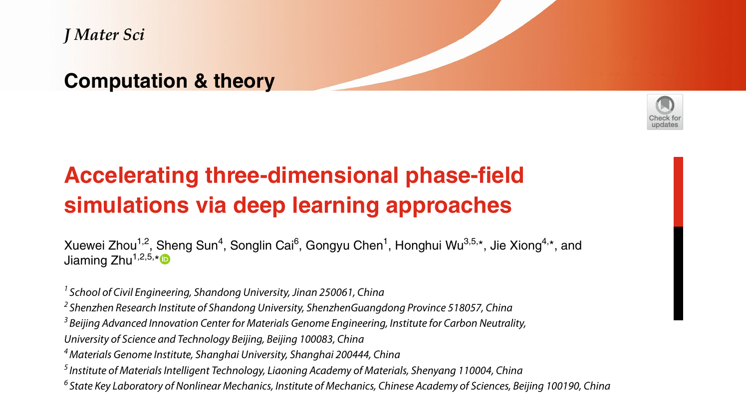 相关成果以 Accelerating three-dimensional phase-field simulations via deep learning approaches为题,发表在国际学术期刊《JOURNAL OF MATERIALS SCIENCE》上。工程力学系朱家明教授为本文的通讯作者,硕士研究生周学伟为第一作者,该论文得到了国家自然科学基金、山东省自然科学基金的支持,太阳成集团tyc9728为本文的第一科研单位和通讯单位。论文链接:https://link.springer.com/article/10.1007/s10853-024-10118-4