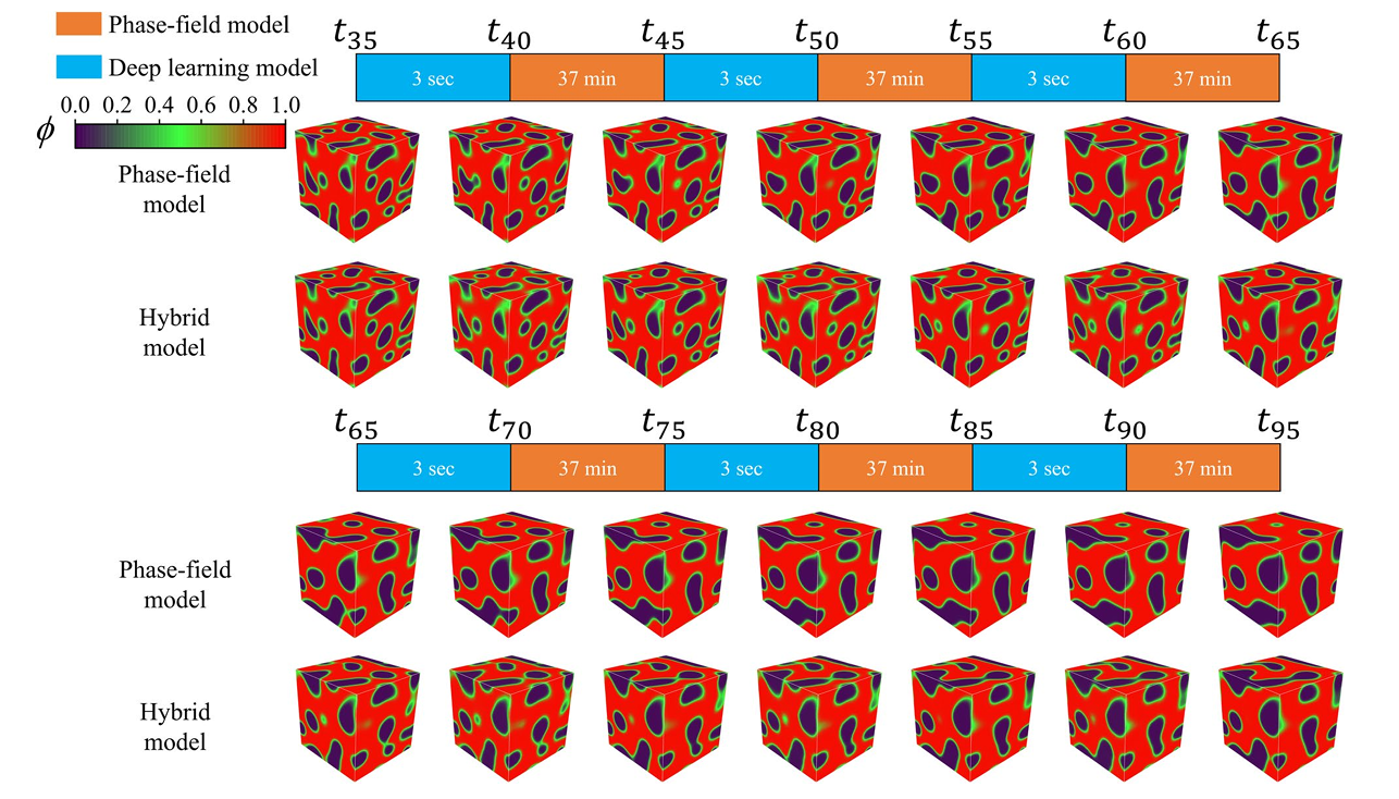 相场模拟是研究材料介尺度结构演化及其与力学性能关系的有效方法。然而,相场模拟需求解时-空关联的高阶偏微分方程,导致高精度、高维度、大体系、长时段相场模拟的时间成本和经济成本非常高昂。近日,太阳集团tyc9728朱家明教授课题组开发了基于卷积神经网络算法的相场模拟代理模型,实现了对微结构演化的时-空预测,提升了代理模型的计算精度,计算误差比国际报道小一个数量级。此外,该代理模型在预测三维结构的时-空演化过程时也表现出较高的精度,为高通量、高精度、高维度、大体系、长时段材料计算奠定了基础。