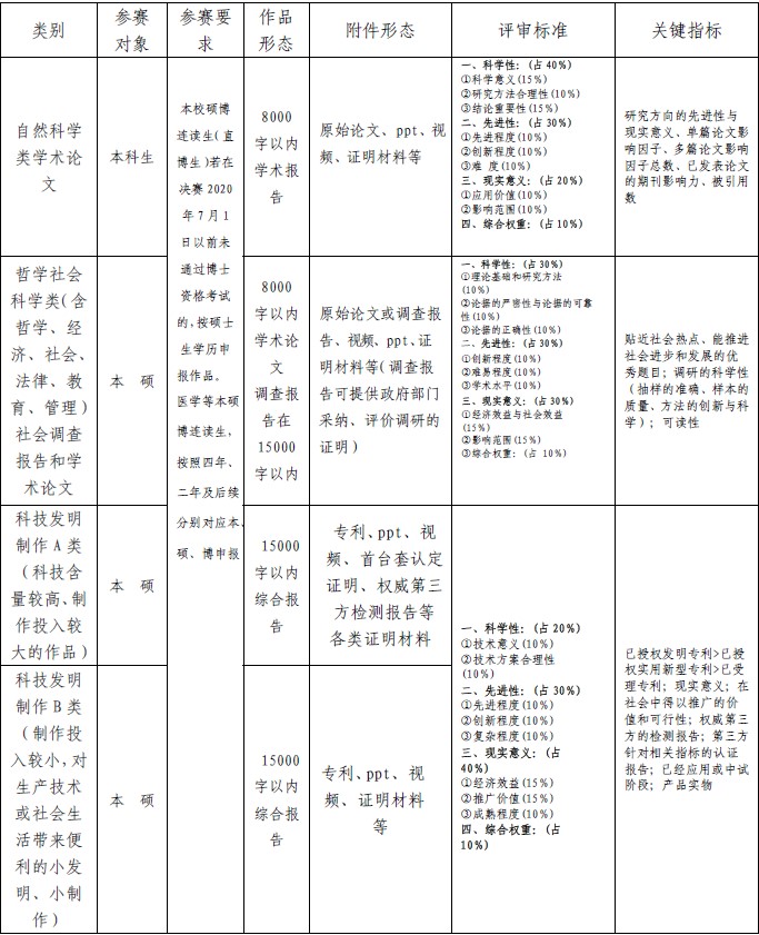 参赛作品分为三大类:自然科学类学术论文、哲学社会科学类(含哲学、经济、社会、法律、教育、管理)社会调查报告和学术论文、科技发明制作。