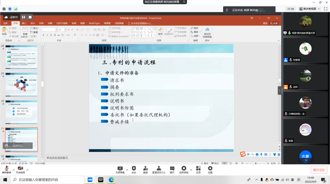 4月9日晚7时,太阳集团tyc9728召开专利申请专题讲座,此次讲座邀请资深知识产权专家、知名知识产权专业讲师、山大校友韩洪淼进行讲解,土木工程系教授武科主持。