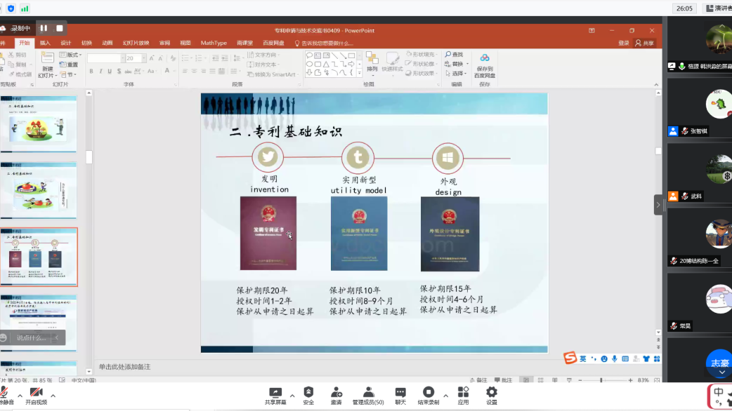 本次讲座以“专利申请与技术交底书撰写”为题。韩洪淼以真实情境带入,通过数个专利侵权案例,给大家讲解了专利申请的意义并指出专利申请对升学、工作的重要性。其次,她向大家介绍专利的基础知识、申请流程和专利申请的客体,指出专利类型分为发明、实用新型和外观设计三种,并介绍了相应的保护期限和授权时间。最后,她向大家重点讲解了技术交底书的撰写部分;如技术交底书的内容包括发明名称、技术领域、背景技术、技术方案和附图等。