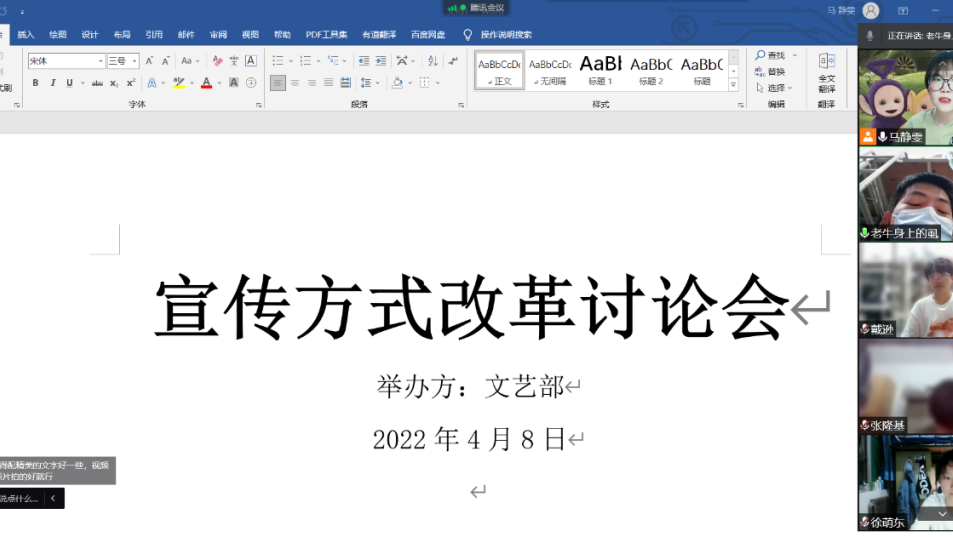 4月8日晚9时,太阳集团tyc9728文艺部召开宣传方式改革讨论会。会议反思总结了目前宣传方式存在的不足,并从宣传范围、执行效率、效果反馈三个层面重新考虑了宣传方式的改革。