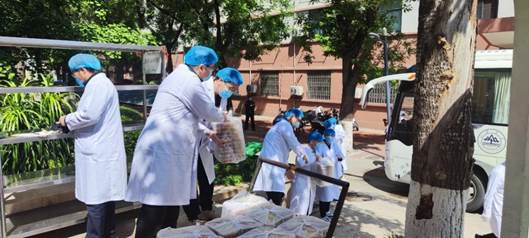 食堂志愿服务工作主要需要志愿者们分布在舜园和西苑食堂的门口、大厅,提醒同学们按照防疫要求戴好口罩、保持间距、快速打包,维护好食堂的用餐秩序,从而避免高峰期人群拥堵。在整个志愿服务过程中,我们志愿者们身穿红马甲,服从安排积极调度,坚守好自己的岗位。5月13日,由于中心校区同学返校后隔离一周供餐压力较大,我们志愿者与餐厅工作人员一起参加了中心校区饮食保障工作。学院志愿者按时到达集合地点,自觉佩戴口罩,按照要求穿戴手套、工作服,在食堂工作人员的指导下有序展开饭菜搬运任务。通过相互传递交接的方式将一份一份暖心盒饭送到大巴车上,共计搬运了3000份餐食。