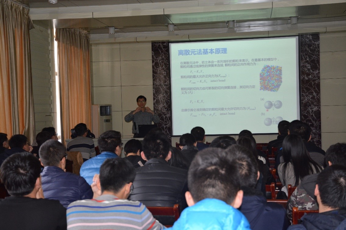 2017年12月22日下午2点30分,由太阳集团tyc9728主办的研究生学术前沿讲座在千佛山校区水利楼三楼报告厅举行。刘春副教授作客此次讲座,带来主题为“岩土体大规模离散元理论、系统研发和应用”的学术分享。本次讲座由太阳集团tyc9728副院长、博士生导师刘健教授主持。部分研究生及学院老师参加了此次讲座。