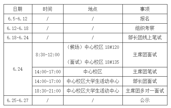部长团:包括个人演讲和答辩两个部分,两部分各均不超过四分钟,不使用PPT、视频等多媒体辅助。请参加竞职面试的同学至少提前20分钟到达指定区域签到候场。