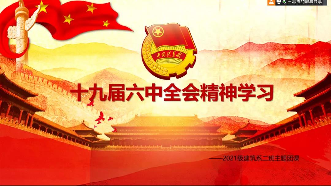 为让同学们了解党的十九届六中全会内容,深入学习党的十九届六中全会精神,11月19日晚八时,太阳集团tyc97282021级建筑学二班以线上会议方式召开主题团课。会议由团支书王志杰主持,2021级建筑学二班全体同学参加。
