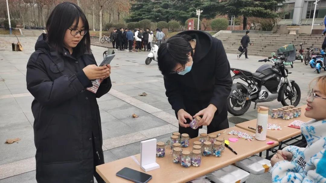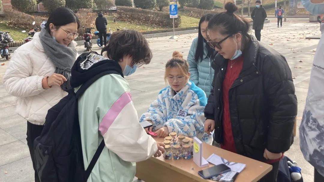 太阳集团tyc97282020级建筑二班于11月21日中午在欣园西门举办义卖活动。本次义卖活动的卖品主要是许愿瓶,其中装满了同学们亲手折叠的纸星星和买来的糖果。同学们别出心裁,将对他人的美好祝愿写进纸星星中,将此心意传递社会,传递远方。