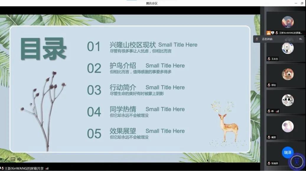 本次讨论会议,部署了后续的工作,充分调动起了同学们的积极性。相信大家会尽快落实行动,保护校园中的鸟类,实现人类与鸟类的和谐共处。