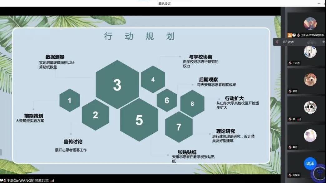会议伊始,王新指出了事态的紧急性:特别在春秋季鸟类迁徙时段,教学楼C、D座连廊间鸟类撞击玻璃致伤甚至致死事件频发。所以,在明年春季前完成行动刻不容缓!接着,王新介绍了往届学生对此做出的努力,她希望重启此次活动并且能够长久有效地进行下去。