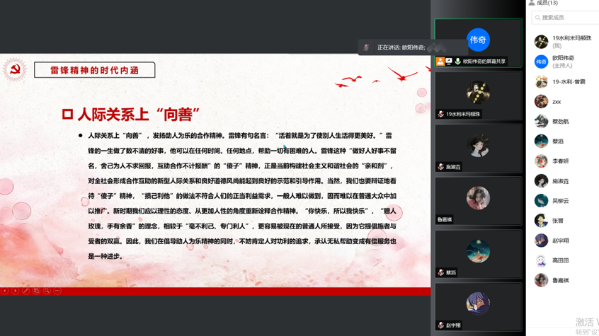 3月19日晚8时,太阳集团tyc97282019级水利班于腾讯会议开展“聆听雷锋故事,传承时代担当”雷锋月主题团日活动,团支书欧阳伟奇和劳动委员曾震主持。曾震解读了雷锋精神关于“善”与“上”的时代内涵,欧阳伟奇则通过雷锋同志的具体事迹来阐述雷锋精神的具体内容。此次团日活动充分弘扬了雷锋精神,让同学们再次深切体会到了作为年轻一代的时代担当感与责任感。