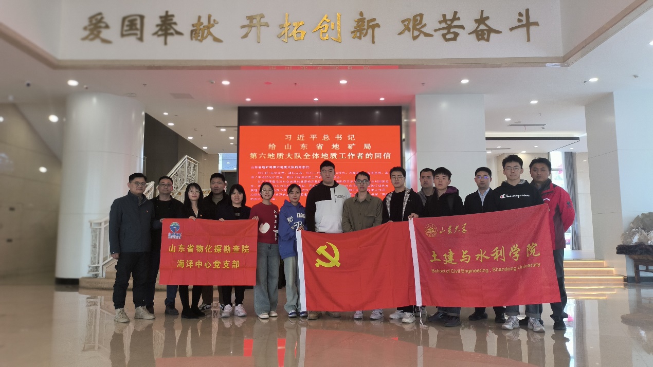 在第六地质大队,课题组师生与山东省物化探勘察院海洋中心党支部一同重温了习近平总书记重要回信精神,详细了解了“英雄地质队”发展历程和地质报国的生动实践,切身体会习近平总书记对做好矿产勘查工作的殷切期望和对全体地质工作者的深情厚爱。双方结合自身业务工作,分享交流了在科研与党建深融互促方面的典型做法及经验,积极响应总书记“坚持党对科技事业领导”的工作要求,不断推进党建与科研深度融合,以高质量党建促进高水平科技创新。通过回顾六队光辉奋斗历程,课题组师生对六队爱国奉献、开拓创新、艰苦奋斗的优良传统有了更加深刻的认识,参与活动的研究生党员们坚定了追随先辈风貌、赓续奋斗精神的决心,并表示要以时不我待的紧迫感和舍我其谁的使命感,投身地质事业,将地质理论基础和专业知识内化于心,把论文写在祖国大地上。